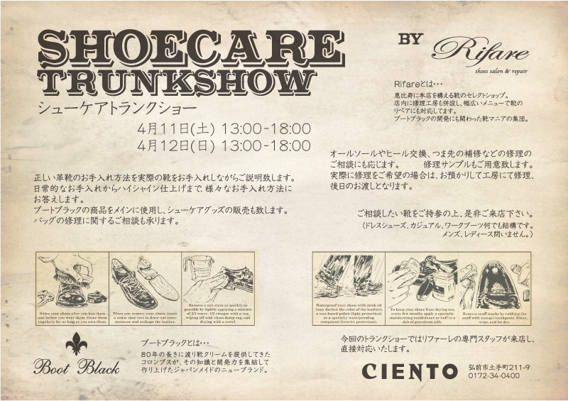 毎年春の恒例イベント 青森 弘前の名店「Ciento」でのシューケア&リペアイベントが開催です。